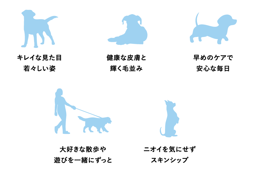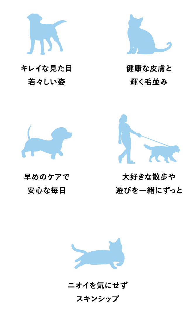 愛犬愛猫の状態により異なりますが、早くて4週間(1ヶ月)、多くは12~24週間(3~6ヶ月)ぐらいで違いがわかるようです。 最初の2週間を倍量で与えてから、継続して12週間(3ヶ月)、できれば24週間(6ヶ月)は毎日適正量を与えてみることをおすすめします。